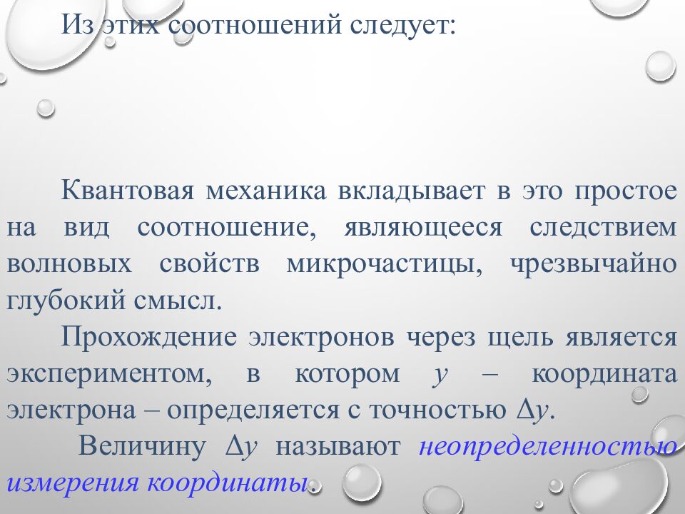 Из этих соотношений следует: Квантовая механика вкладывает в это простое на вид соотношение, являющееся следствием волновых свойств микрочастицы, чрезвычайно глубокий смысл. Прохождение электронов через щель является экспериментом, в котором y – координата электрона – определяется с точностью Δ y. Величину Δ y называют неопределенностью измерения координаты.