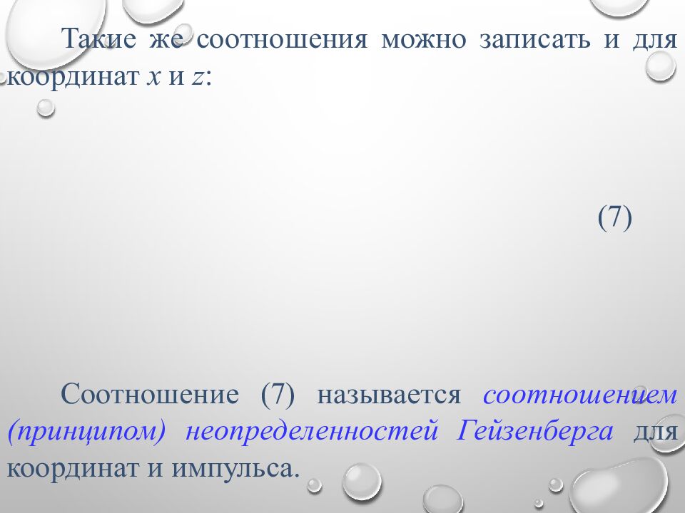 Такие же соотношения можно записать и для координат x и z : (7) Соотношение (7) называется соотношением (принципом) неопределенностей Гейзенберга для координат и импульса.