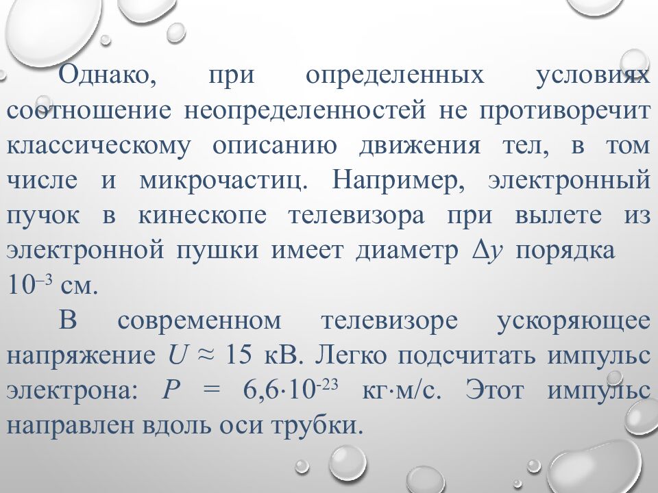 Однако, при определенных условиях соотношение неопределенностей не противоречит классическому описанию движения тел, в том числе и микрочастиц. Например, электронный пучок в кинескопе телевизора при вылете из электронной пушки имеет диаметр Δ y порядка 10 –3 см. В современном телевизоре ускоряющее напряжение U ≈ 15 кВ. Легко подсчитать импульс электрона: P = 6,6 10 -23 кг м/с. Этот импульс направлен вдоль оси трубки.