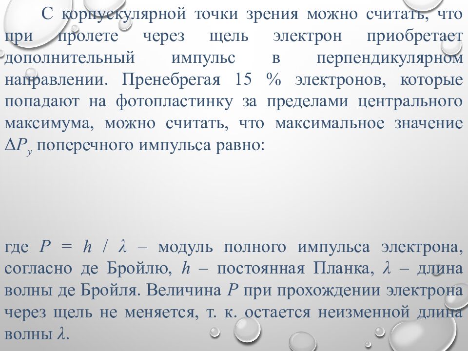 С корпускулярной точки зрения можно считать, что при пролете через щель электрон приобретает дополнительный импульс в перпендикулярном направлении. Пренебрегая 15 % электронов, которые попадают на фотопластинку за пределами центрального максимума, можно считать, что максимальное значение Δ P y поперечного импульса равно: где P = h / λ – модуль полного импульса электрона, согласно де Бройлю, h – постоянная Планка, λ – длина волны де Бройля. Величина P при прохождении электрона через щель не меняется, т. к. остается неизменной длина волны λ.
