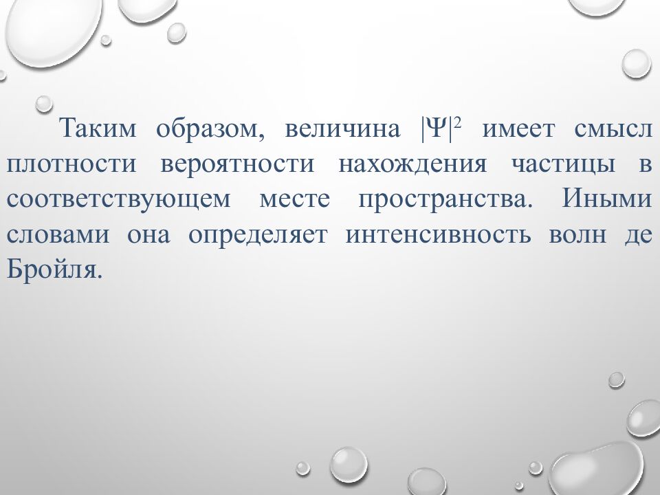 Таким образом, величина |Ψ| 2 имеет смысл плотности вероятности нахождения частицы в соответствующем месте пространства. Иными словами она определяет интенсивность волн де Бройля.