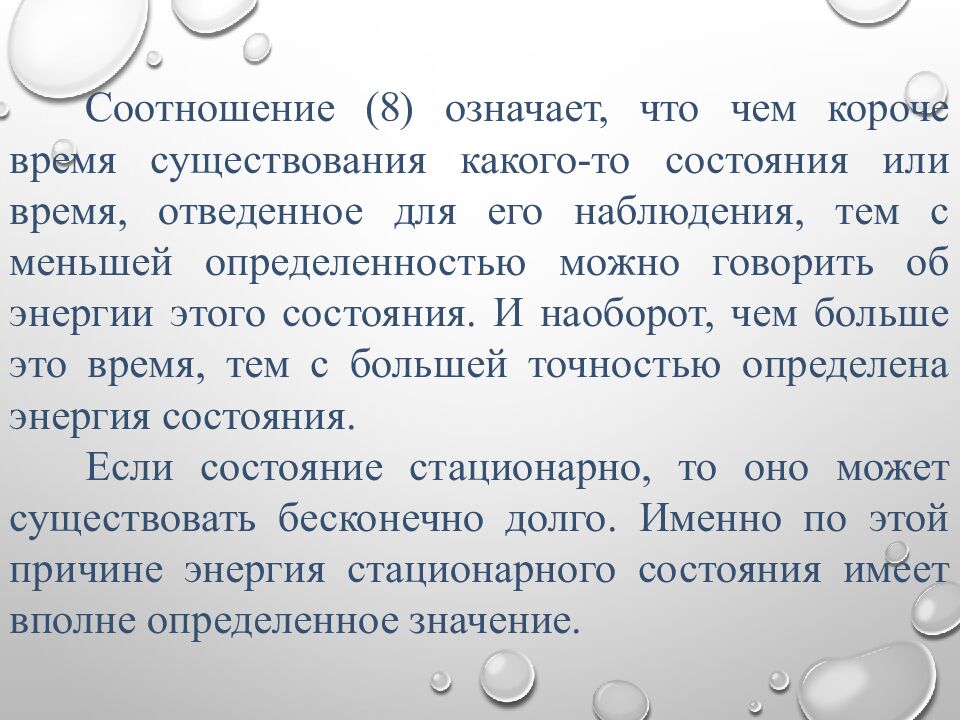 Соотношение (8) означает, что чем короче время существования какого-то состояния или время, отведенное для его наблюдения, тем с меньшей определенностью можно говорить об энергии этого состояния. И наоборот, чем больше это время, тем с большей точностью определена энергия состояния. Если состояние стационарно, то оно может существовать бесконечно долго. Именно по этой причине энергия стационарного состояния имеет вполне определенное значение.