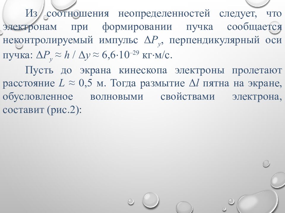 Из соотношения неопределенностей следует, что электронам при формировании пучка сообщается неконтролируемый импульс Δ P y, перпендикулярный оси пучка: Δ P y ≈ h / Δ y ≈ 6,6 10 –29 кг м/с. Пусть до экрана кинескопа электроны пролетают расстояние L ≈ 0,5 м. Тогда размытие Δ l пятна на экране, обусловленное волновыми свойствами электрона, составит (рис.2):