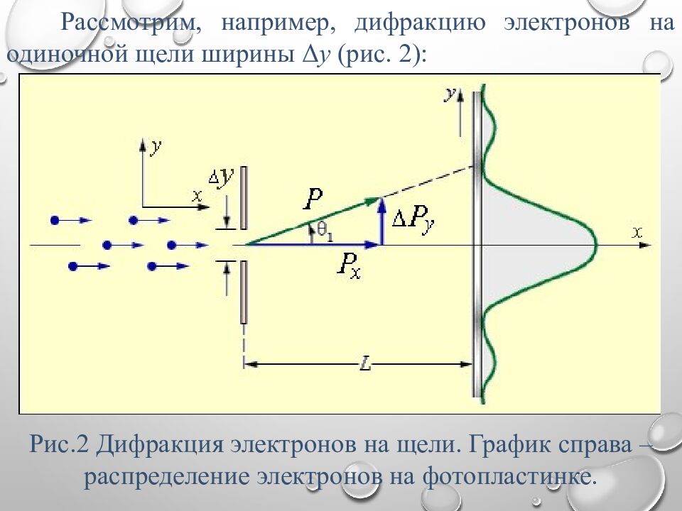 Рассмотрим, например, дифракцию электронов на одиночной щели ширины Δ y (рис. 2): Рис.2 Дифракция электронов на щели. График справа – распределение электронов на фотопластинке.