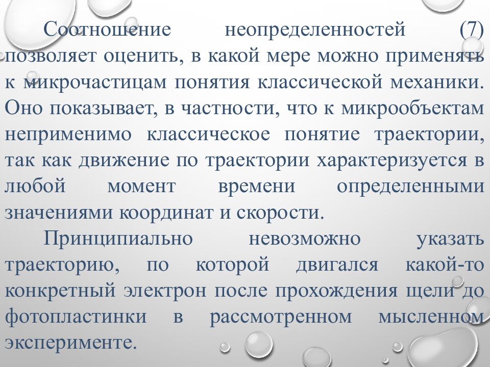 Соотношение неопределенностей (7) позволяет оценить, в какой мере можно применять к микрочастицам понятия классической механики. Оно показывает, в частности, что к микрообъектам неприменимо классическое понятие траектории, так как движение по траектории характеризуется в любой момент времени определенными значениями координат и скорости. Принципиально невозможно указать траекторию, по которой двигался какой-то конкретный электрон после прохождения щели до фотопластинки в рассмотренном мысленном эксперименте.