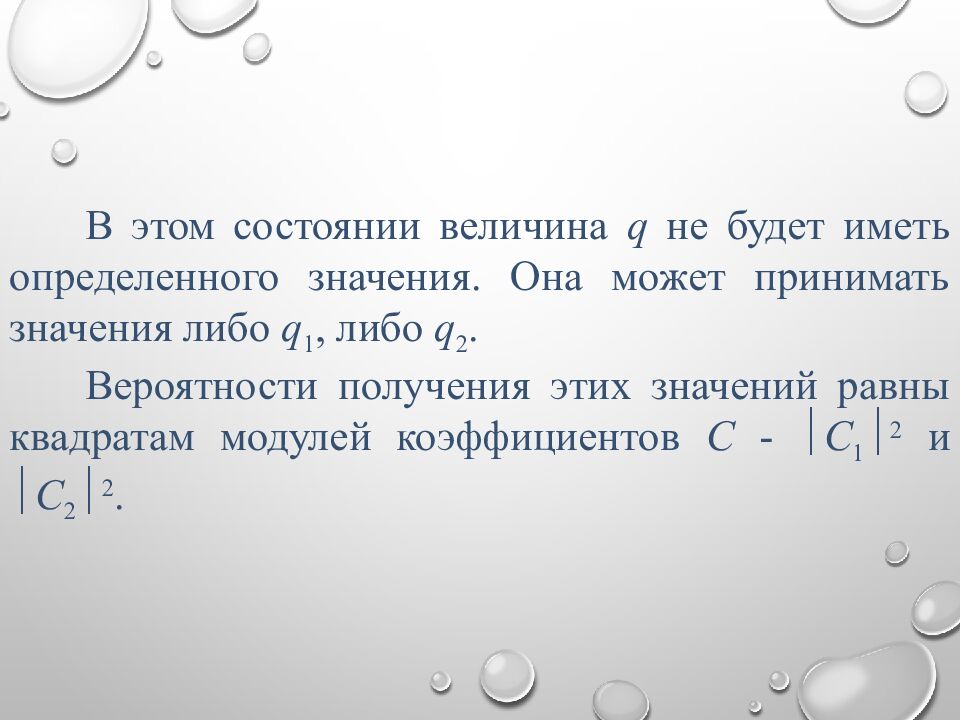 В этом состоянии величина q не будет иметь определенного значения. Она может принимать значения либо q 1, либо q 2. Вероятности получения этих значений равны квадратам модулей коэффициентов С - С 1 2 и С 2 2.