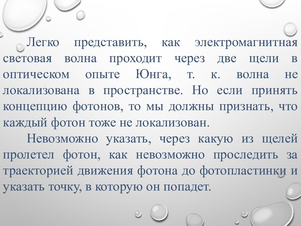 Легко представить, как электромагнитная световая волна проходит через две щели в оптическом опыте Юнга, т. к. волна не локализована в пространстве. Но если принять концепцию фотонов, то мы должны признать, что каждый фотон тоже не локализован. Невозможно указать, через какую из щелей пролетел фотон, как невозможно проследить за траекторией движения фотона до фотопластинки и указать точку, в которую он попадет.