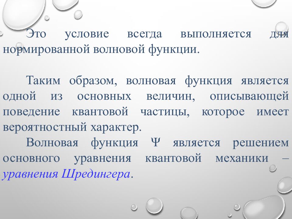 Это условие всегда выполняется для нормированной волновой функции. Таким образом, волновая функция является одной из основных величин, описывающей поведение квантовой частицы, которое имеет вероятностный характер. Волновая функция Ψ является решением основного уравнения квантовой механики – уравнения Шредингера.