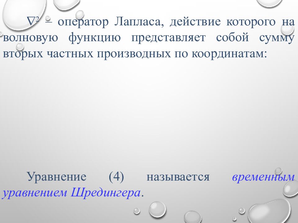 2 – оператор Лапласа, действие которого на волновую функцию представляет собой сумму вторых частных производных по координатам: Уравнение (4) называется временным уравнением Шредингера.