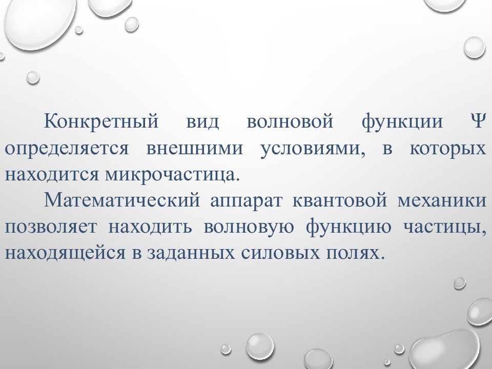 Конкретный вид волновой функции Ψ определяется внешними условиями, в которых находится микрочастица. Математический аппарат квантовой механики позволяет находить волновую функцию частицы, находящейся в заданных силовых полях.