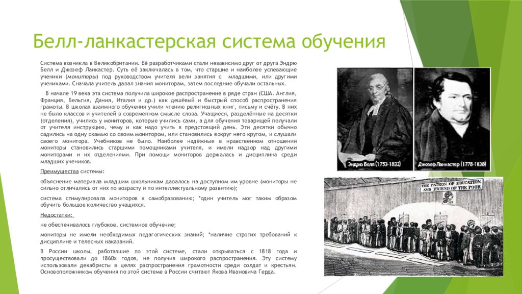 Система возникла в Великобритании. Её разработчиками стали независимо друг от друга Эндрю Белл и Джозеф Ланкастер. Суть её заключалась в том, что старшие и наиболее успевающие ученики ( мониторы ) под руководством учителя вели занятия с младшими, или другими учениками. Сначала учитель давал знания мониторам, затем последние обучали остальных. В начале 19 века эта система получила широкое распространение в ряде стран (США. Англия, Франция, Бельгия, Дания, Италия и др.) как дешёвый и быстрый способ распространения грамоты. В школах взаимного обучения учили чтению религиозных книг, письму и счёту. В них не было классов и учителей в современном смысле слова. Учащиеся, разделённые на десятки (отделения), учились у мониторов, которые учились сами, а для обучения товарищей получали от учителя инструкцию, чему и как надо учить в предстоящий день. Эти десятки обычно садились на одну скамью со своим монитором, или становились вокруг него кругом, и слушали своего монитора. Учебников не было. Наиболее надёжные в нравственном отношении мониторы становились старшими помощниками учителя, и имели надзор над другими мониторами и их отделениями. При помощи мониторов держалась и дисциплина среди младших учеников. Преимущества системы: объяснение материала младшим школьникам давалось на доступном им уровне (мониторы не сильно отличались от них по возрасту и по интеллектуальному развитию); система стимулировала мониторов к самобразованию ; *один учитель мог таким образом обучить большое количество учащихся. Недостатки: не обеспечивалось глубокое, системное обучение ; мониторы не имели необходимых педагогических знаний; *наличие строгих требований к дисциплине и телесных наказаний. В России школы, работавшие по этой системе, стали открываться с 1818 года и просуществовали до 1860х годов, не получив широкого распространения. Эту систему использовали декабристы в целях распространения грамотности среди солдат и крестьян. Основоположником обучения по этой системе в России считают Якова Ивановича Герда.