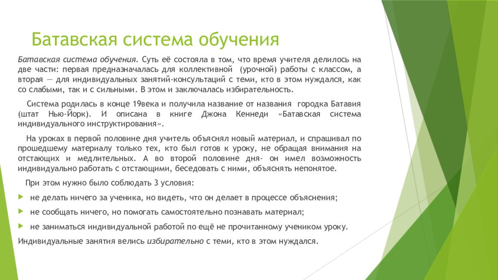 Батавская система обучения. Суть её состояла в том, что время учителя делилось на две части: первая предназначалась для коллективной (урочной) работы с классом, а вторая ― для индивидуальных занятий-консультаций с теми, кто в этом нуждался, как со слабыми, так и с сильными. В этом и заключалась избирательность. Система родилась в конце 19века и получила название от названия городка Батавия (штат Нью-Йорк). И описана в книге Джона Кеннеди « Батавская система индивидуального инструктирования». На уроках в первой половине дня учитель объяснял новый материал, и спрашивал по прошедшему материалу только тех, кто был готов к уроку, не обращая внимания на отстающих и медлительных. А во второй половине дня- он имел возможность индивидуально работать с отстающими, беседовать с ними, объяснять непонятое. При этом нужно было соблюдать 3 условия: не делать ничего за ученика, но видеть, что он делает в процессе объяснения; не сообщать ничего, но помогать самостоятельно познавать материал; не заниматься индивидуальной работой по ещё не прочитанному учеником уроку. Индивидуальные занятия велись избирательно с теми, кто в этом нуждался.