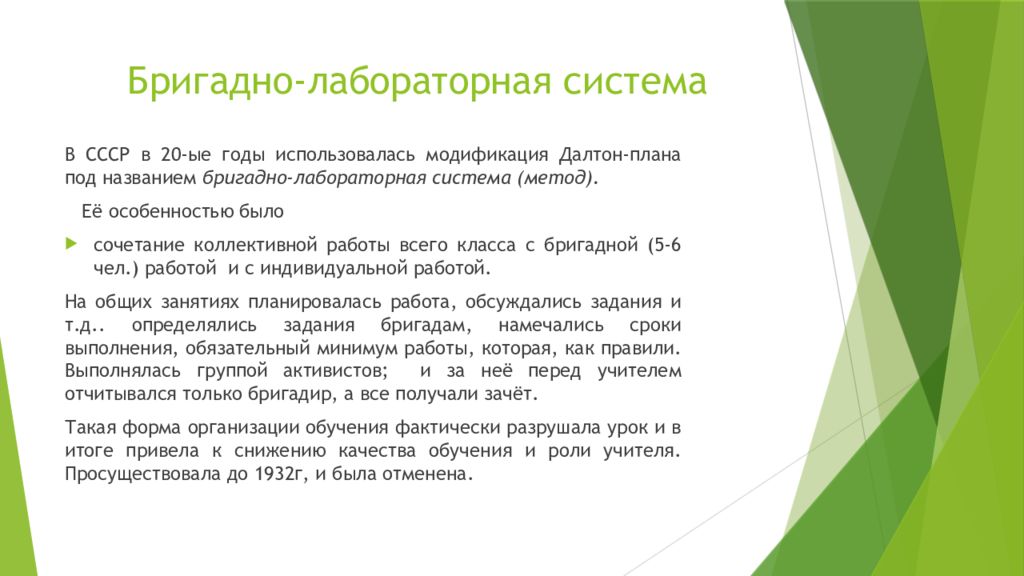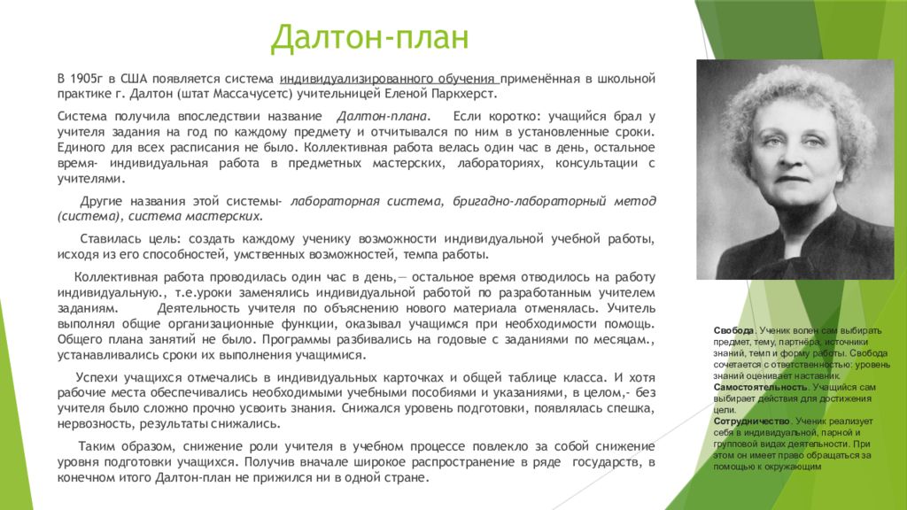 В 1905г в США появляется система индивидуализированного обучения применённая в школьной практике г. Далтон (штат Массачусетс) учительницей Еленой Паркхерст. Система получила впоследствии название Далтон -плана. Если коротко: учащийся брал у учителя задания на год по каждому предмету и отчитывался по ним в установленные сроки. Единого для всех расписания не было. Коллективная работа велась один час в день, остальное время- индивидуальная работа в предметных мастерских, лабораториях, консультации с учителями. Другие названия этой системы- лабораторная система, бригадно-лабораторный метод (система), система мастерских. Ставилась цель: создать каждому ученику возможности индивидуальной учебной работы, исходя из его способностей, умственных возможностей, темпа работы. Коллективная работа проводилась один час в день,― остальное время отводилось на работу индивидуальную., т.е.уроки заменялись индивидуальной работой по разработанным учителем заданиям. Деятельность учителя по объяснению нового материала отменялась. Учитель выполнял общие организационные функции, оказывал учащимся при необходимости помощь. Общего плана занятий не было. Программы разбивались на годовые с заданиями по месяцам., устанавливались сроки их выполнения учащимися. Успехи учащихся отмечались в индивидуальных карточках и общей таблице класса. И хотя рабочие места обеспечивались необходимыми учебными пособиями и указаниями, в целом,- без учителя было сложно прочно усвоить знания. Снижался уровень подготовки, появлялась спешка, нервозность, результаты снижались. Таким образом, снижение роли учителя в учебном процессе повлекло за собой снижение уровня подготовки учащихся. Получив вначале широкое распространение в ряде государств, в конечном итого Далтон -план не прижился ни в одной стране. Свобода. Ученик волен сам выбирать предмет, тему, партнёра, источники знаний, темп и форму работы. Свобода сочетается с ответственностью: уровень знаний оценивает наставник. Самостоятельность. Учащийся сам выбирает действия для достижения цели. Сотрудничество. Ученик реализует себя в индивидуальной, парной и групповой видах деятельности. При этом он имеет право обращаться за помощью к окружающим