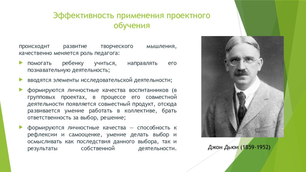 происходит развитие творческого мышления, качественно меняется роль педагога : помогать ребенку учиться, направлять его познавательную деятельность; вводятся элементы исследовательской деятельности; формируются личностные качества воспитанников (в групповых проектах, в процессе его совместной деятельности появляется совместный продукт, отсюда развивается умение работать в коллективе, брать ответственность за выбор, решение ; формируются личностные качества — способность к рефлексии и самооценке, умение делать выбор и осмысливать как последствия данного выбора, так и результаты собственной деятельности. Джон Дьюи (1859-1952)