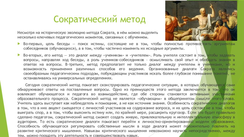 Несмотря на историческую эволюцию метода Сократа, в нём можно выделить несколько ключевых педагогических моментов, связанных с обучением. Во-первых, цель беседы ― поиск истины, состоящие не в том, чтобы полностью противостоять аргументам собеседников (обучающихся), а в том, чтобы частично изменить их исходные аргументы. Во-вторых, его метод ― это диалог между «учеником» и «учителем». Роль учителя состоит в том, чтобы задавать вопросы, направляя ход беседы, а роль учеников-собеседников – осмысливать свой опыт и обобщать знания в ответах на вопросы. В-третьих, метод предполагает не только диалог между учителем и учениками, но и возможность применения различных способов его ведения. Организованные диалоги Сократа являлись своеобразным педагогическим подходом, побуждающим участников искать более глубокое понимание понятий, не останавливаясь на универсальных определениях. Сегодня сократический метод помогает сконструировать педагогические ситуации, в которых обучающиеся сами обнаруживают ответы на поставленные вопросы. Одно из преимуществ этого метода заключается в том, что он вовлекает обучающегося и педагога во взаимодействие, где обе стороны становятся активными участниками образовательного процесса. Сократический метод не является «обучающим» в общепринятом смысле этого слова. Учитель здесь выступает как наблюдатель и помощник, а не как источник знания. Особенность сократических диалогов в том, что в них акцент смещается с личностей участников на содержание вопроса, и их цель состоит не в том, чтобы выиграть спор, а в том, чтобы выяснить истину или, по крайней мере, расширить кругозор. Если это будет правильно сделано педагогом, сократический метод сможет создать живую, привлекательную и интеллектуальную атмосферу в аудитории. То есть сократические диалоги помогают перейти к личностно-ориентированной модели образования. Способность обучающегося регулировать собственные мысли в ходе диалога может положительно повлиять на развитие критического мышления. Навыкам критического мышления невозможно научить непосредственно, между тем, можно поощрять эту деятельность и совершенствовать навык.