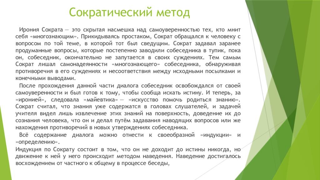 Ирония Сократа — это скрытая насмешка над самоуверенностью тех, кто мнит себя « многознающим ». Прикидываясь простаком, Сократ обращался к человеку с вопросом по той теме, в которой тот был сведущим. Сократ задавал заранее продуманные вопросы, которые постепенно заводили собеседника в тупик, пока он, собеседник, окончательно не запутается в своих суждениях. Тем самым Сократ лишал самонадеянности « многознающего » собеседника, обнаруживая противоречия в его суждениях и несоответствия между исходными посылками и конечными выводами. После прохождения данной части диалога собеседник освобождался от своей самоуверенности и был готов к тому, чтобы сообща искать истину. И теперь, за «иронией», следовала « майевтика » — «искусство помочь родиться знанию». Сократ считал, что знания уже содержатся в головах слушателей, и задачей учителя видел лишь извлечение этих знаний на поверхность, доведение их до сознания человека, что он и делал путём задавания наводящих вопросов или же нахождения противоречий в новых утверждениях собеседника. Всё содержание диалога можно отнести к своеобразной «индукции» и «определению». Индукция по Сократу состоит в том, что он не доходит до истины никогда, но движение к ней у него происходит методом наведения. Наведение достигалось восхождением от частного к общему в процессе беседы,