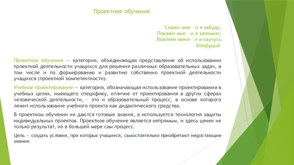 Скажи мне – и я забуду, Покажи мне – и я запомню, Вовлеки меня – и я научусь Конфуций Проектное обучение ― категория, объединяющая представление об использовании проектной деятельности учащихся для решения различных образовательных задач, в том числе и по формированию и развитию собственно проектной деятельности учащихся (проектной компетентности). Учебное проектирование ― категория, обозначающая использование проектирования в учебных целях, имеющего специфику, отличие от проектирования в других сферах человеческой деятельности, – это и образовательный процесс, в основе которого лежит использование учебного проекта как дидактического средства. В проектном обучении не даются готовые знания, а используется технология защиты индивидуальных проектов. Проектное обучение является непрямым, и здесь ценен не только результат, но в большей мере сам процесс. Цель ― с оздать условия, при которых учащиеся, самостоятельно приобретают недостающие знания.
