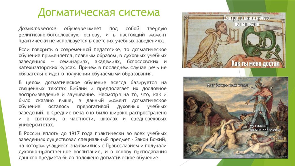 Догматическое обучение имеет под собой твердую религиозно-богословскую основу, и в настоящий момент практически не используется в светских учебных заведениях. Если говорить о современной педагогике, то догматическое обучение применяется, главным образом, в духовных учебных заведениях ― семинариях, академиях, богословских и катехизаторских курсах. Причем в последнем случае речь не обязательно идет о получении обучаемыми образования. В целом догматическое обучение всегда базируется на священных текстах Библии и предполагает их дословное воспроизведение и заучивание. Несмотря на то, что, как и было сказано выше, в данный момент догматическое обучение осталось прерогативой духовных учебных заведений, в Средние века оно было широко распространено и в светских, в частности, школах и средневековых университетах. В России вплоть до 1917 года практически во всех учебных заведениях существовал специальный предмет – Закон Божий, на котором учащиеся знакомились с Православием и получали духовно-нравственное воспитание, и в основу преподавания данного предмета было положено догматическое обучение.