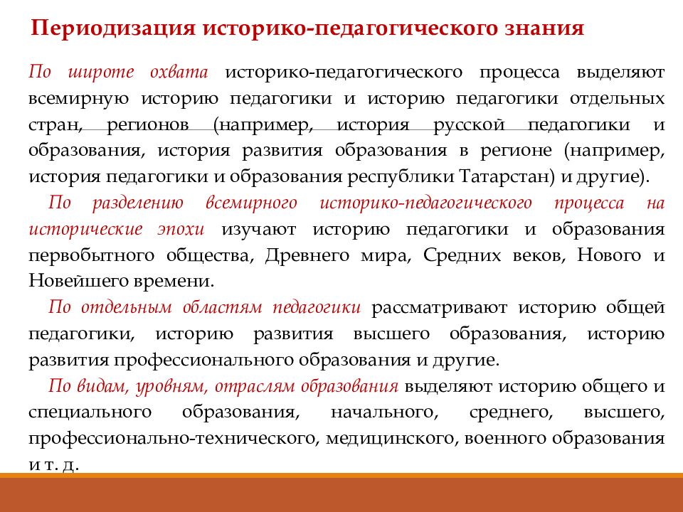 Периодизация историко-педагогического знания По широте охвата историко-педагогического процесса выделяют всемирную историю педагогики и историю педагогики отдельных стран, регионов (например, история русской педагогики и образования, история развития образования в регионе (например, история педагогики и образования республики Татарстан) и другие). По разделению всемирного историко-педагогического процесса на исторические эпохи изучают историю педагогики и образования первобытного общества, Древнего мира, Средних веков, Нового и Новейшего времени. По отдельным областям педагогики рассматривают историю общей педагогики, историю развития высшего образования, историю развития профессионального образования и другие. По видам, уровням, отраслям образования выделяют историю общего и специального образования, начального, среднего, высшего, профессионально-технического, медицинского, военного образования и т. д.