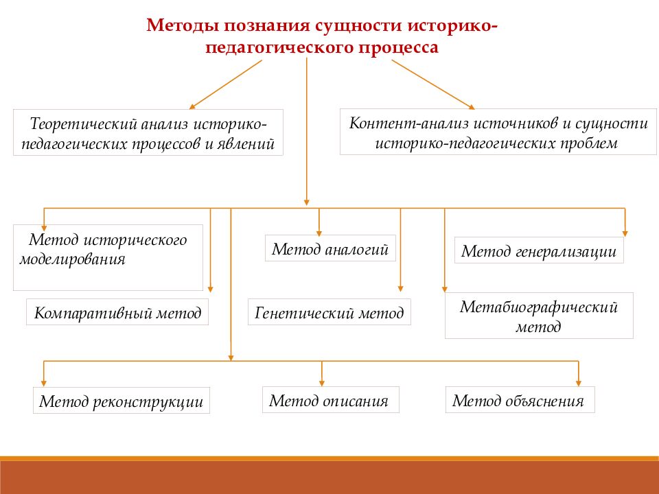 Методы познания сущности историко-педагогического процесса Теоретический анализ историко-педагогических процессов и явлений Контент-анализ источников и сущности историко-педагогических проблем Метод исторического моделирования Метод аналогий Метод генерализации Компаративный метод Генетический метод Метабиографический метод Метод реконструкции Метод описания Метод объяснения