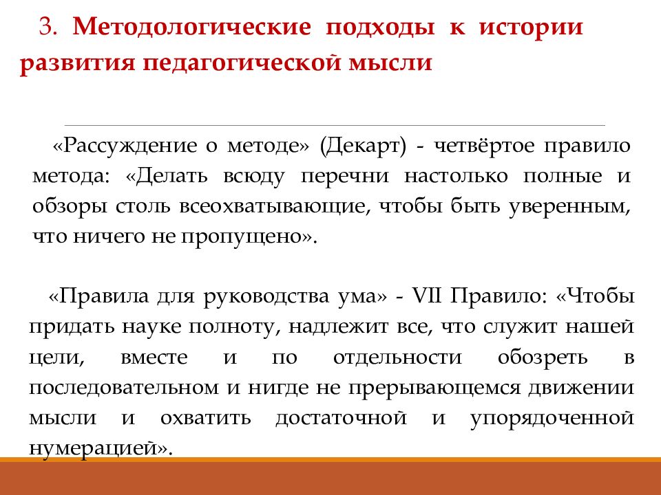 3. Методологические подходы к истории развития педагогической мысли «Рассуждение о методе» (Декарт) - четвёртое правило метода: «Делать всюду перечни настолько полные и обзоры столь всеохватывающие, чтобы быть уверенным, что ничего не пропущено». «Правила для руководства ума» - VII Правило: «Чтобы придать науке полноту, надлежит все, что служит нашей цели, вместе и по отдельности обозреть в последовательном и нигде не прерывающемся движении мысли и охватить достаточной и упорядоченной нумерацией».