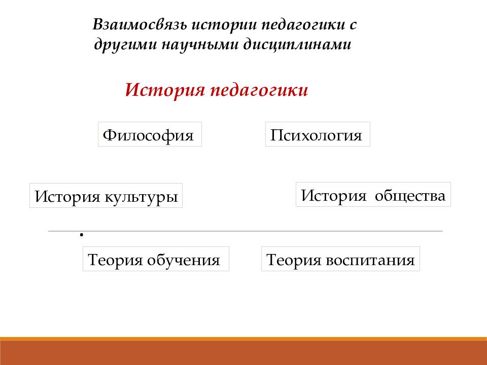 . Взаимосвязь истории педагогики с другими научными дисциплинами Философия История общества История культуры Психология Теория обучения Теория воспитания История педагогики
