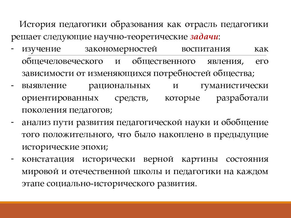 История педагогики образования как отрасль педагогики решает следующие научно-теоретические задачи : изучение закономерностей воспитания как общечеловеческого и общественного явления, его зависимости от изменяющихся потребностей общества; выявление рациональных и гуманистически ориентированных средств, которые разработали поколения педагогов; анализ пути развития педагогической науки и обобщение того положительного, что было накоплено в предыдущие исторические эпохи; констатация исторически верной картины состояния мировой и отечественной школы и педагогики на каждом этапе социально-исторического развития.