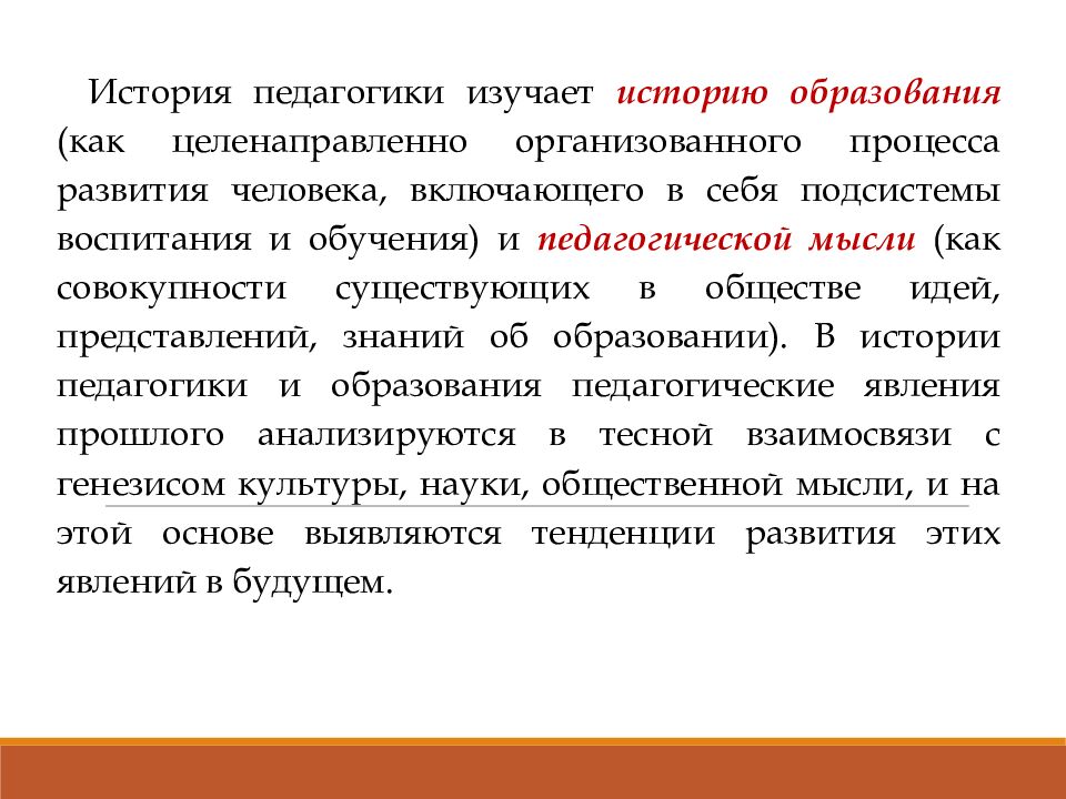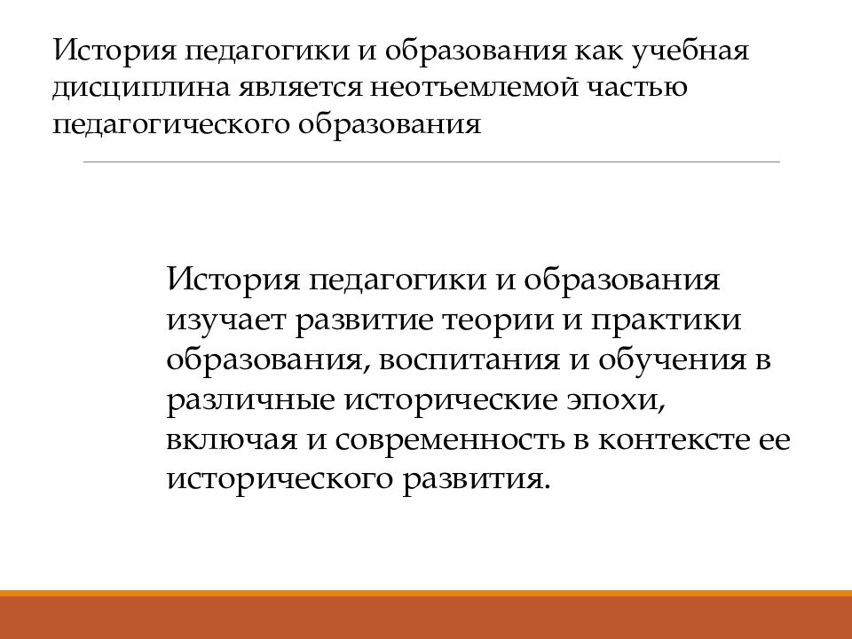 История педагогики и образования как учебная дисциплина является неотъемлемой частью педагогического образования История педагогики и образования изучает развитие теории и практики образования, воспитания и обучения в различные исторические эпохи, включая и современность в контексте ее исторического развития.