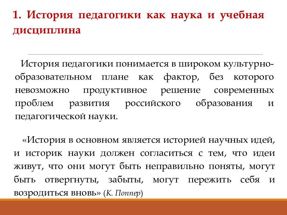1. История педагогики как наука и учебная дисциплина История педагогики понимается в широком культурно-образовательном плане как фактор, без которого невозможно продуктивное решение современных проблем развития российского образования и педагогической науки. « История в основном является историей научных идей, и историк науки должен согласиться с тем, что идеи живут, что они могут быть неправильно поняты, могут быть отвергнуты, забыты, могут пережить себя и возродиться вновь » ( К. Поппер )