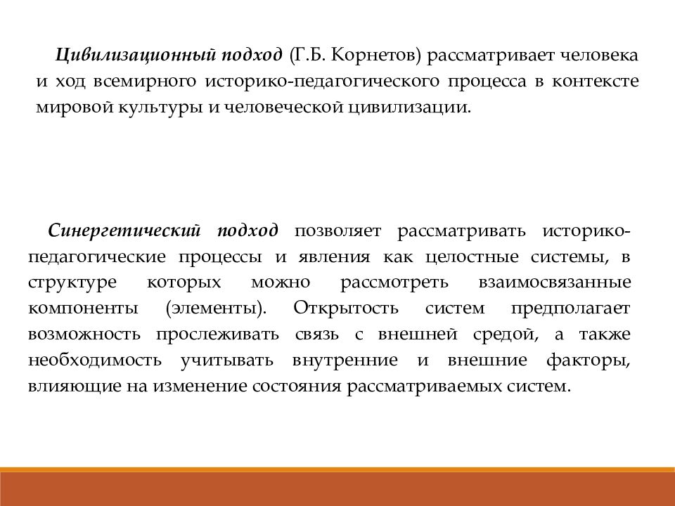 Цивилизационный подход (Г.Б. Корнетов ) рассматривает человека и ход всемирного историко-педагогического процесса в контексте мировой культуры и человеческой цивилизации. Синергетический подход позволяет рассматривать историко-педагогические процессы и явления как целостные системы, в структуре которых можно рассмотреть взаимосвязанные компоненты (элементы). Открытость систем предполагает возможность прослеживать связь с внешней средой, а также необходимость учитывать внутренние и внешние факторы, влияющие на изменение состояния рассматриваемых систем.