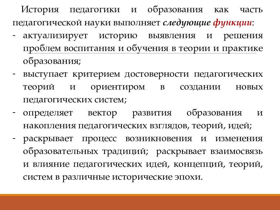 История педагогики и образования как часть педагогической науки выполняет следующие функции : актуализирует историю выявления и решения проблем воспитания и обучения в теории и практике образования; выступает критерием достоверности педагогических теорий и ориентиром в создании новых педагогических систем; определяет вектор развития образования и накопления педагогических взглядов, теорий, идей; раскрывает процесс возникновения и изменения образовательных традиций; раскрывает взаимосвязь и влияние педагогических идей, концепций, теорий, систем в различные исторические эпохи.