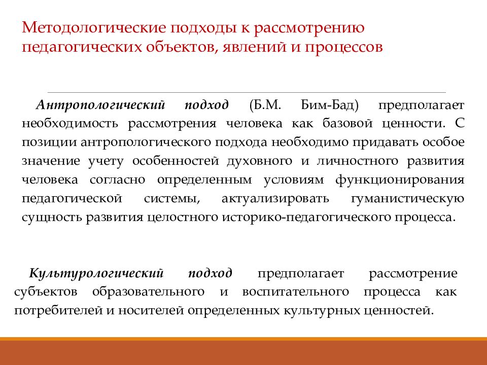 Методологические подходы к рассмотрению педагогических объектов, явлений и процессов Антропологический подход (Б.М. Бим- Бад ) предполагает необходимость рассмотрения человека как базовой ценности. С позиции антропологического подхода необходимо придавать особое значение учету особенностей духовного и личностного развития человека согласно определенным условиям функционирования педагогической системы, актуализировать гуманистическую сущность развития целостного историко-педагогического процесса. Культурологический подход предполагает рассмотрение субъектов образовательного и воспитательного процесса как потребителей и носителей определенных культурных ценностей.