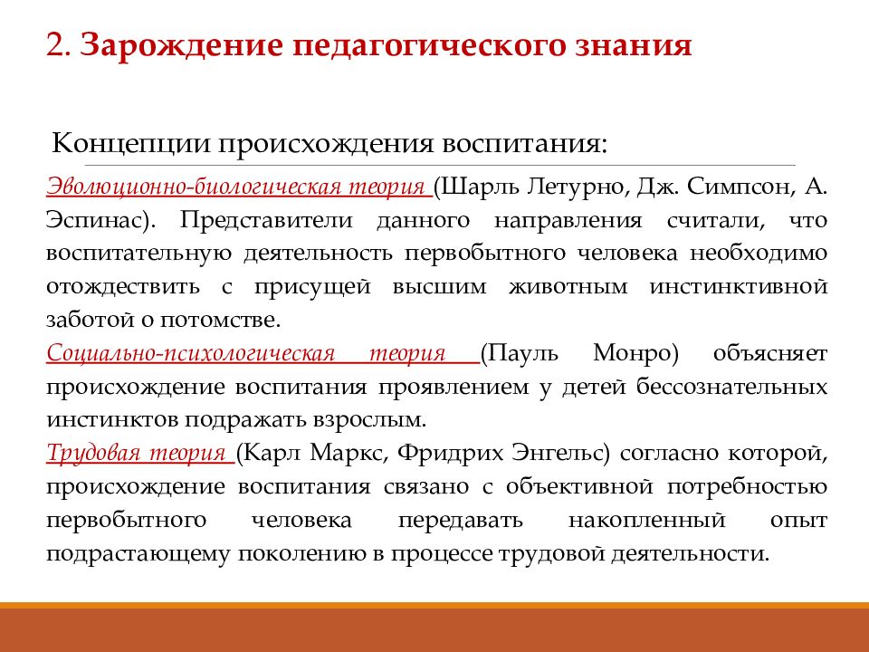 2. Зарождение педагогического знания Концепции происхождения воспитания: Эволюционно-биологическая теория (Шарль Летурно, Дж. Симпсон, А. Эспинас ). Представители данного направления считали, что воспитательную деятельность первобытного человека необходимо отождествить с присущей высшим животным инстинктивной заботой о потомстве. Социально-психологическая теория (Пауль Монро) объясняет происхождение воспитания проявлением у детей бессознательных инстинктов подражать взрослым. Трудовая теория (Карл Маркс, Фридрих Энгельс) согласно которой, происхождение воспитания связано с объективной потребностью первобытного человека передавать накопленный опыт подрастающему поколению в процессе трудовой деятельности.