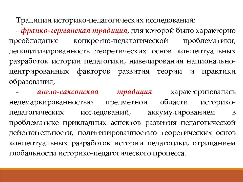 Традиции историко-педагогических исследований: - франко-германская традиция, для которой было характерно преобладание конкретно-педагогической проблематики, деполитизированность теоретических основ концептуальных разработок истории педагогики, нивелирования национально-центрированных факторов развития теории и практики образования; - англо-саксонская традиция характеризовалась недемаркированностью предметной области историко-педагогических исследований, аккумулированием в проблематике прикладных аспектов развития педагогической действительности, политизированностью теоретических основ концептуальных разработок истории педагогики, отрицанием глобальности историко-педагогического процесса.