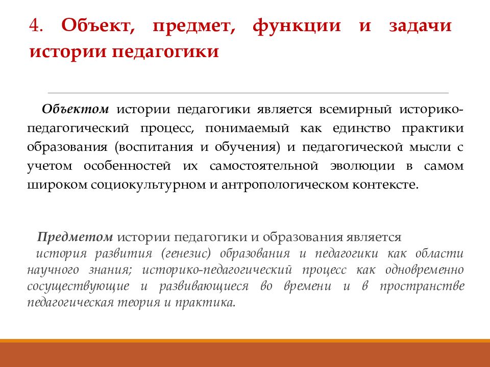 4. Объект, предмет, функции и задачи истории педагогики Объектом истории педагогики является всемирный историко-педагогический процесс, понимаемый как единство практики образования (воспитания и обучения) и педагогической мысли с учетом особенностей их самостоятельной эволюции в самом широком социокультурном и антропологическом контексте. Предметом истории педагогики и образования является история развития (генезис) образования и педагогики как области научного знания ; историко-педагогический процесс как одновременно сосуществующие и развивающиеся во времени и в пространстве педагогическая теория и практика.