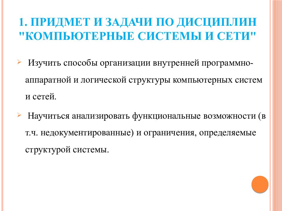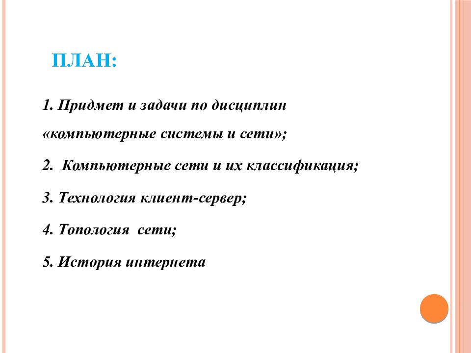 1. Придмет и задачи по дисциплин «компьютерные системы и сети»; 2. Компьютерные сети и их классификация; 3. Технология клиент-сервер; 4. Топология сети; 5. История интернета