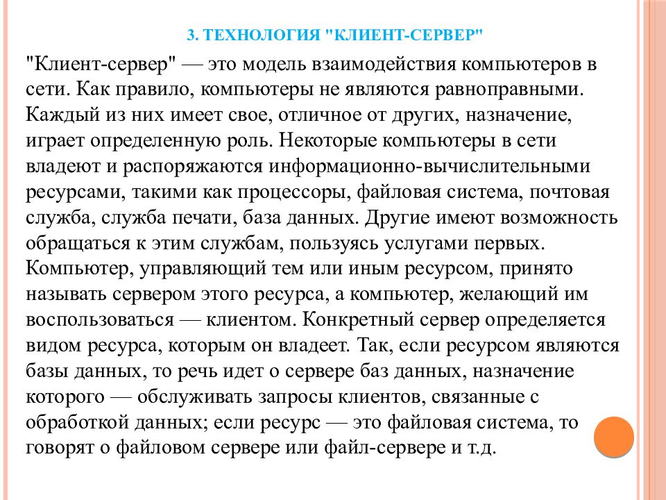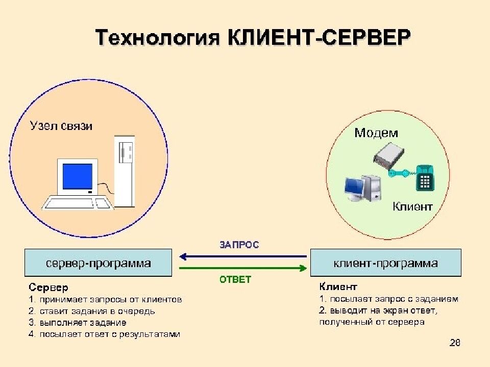 "Клиент-сервер" — это модель взаимодействия компьютеров в сети. Как правило, компьютеры не являются равноправными. Каждый из них имеет свое, отличное от других, назначение, играет определенную роль. Некоторые компьютеры в сети владеют и распоряжаются информационно-вычислительными ресурсами, такими как процессоры, файловая система, почтовая служба, служба печати, база данных. Другие имеют возможность обращаться к этим службам, пользуясь услугами первых. Компьютер, управляющий тем или иным ресурсом, принято называть сервером этого ресурса, а компьютер, желающий им воспользоваться — клиентом. Конкретный сервер определяется видом ресурса, которым он владеет. Так, если ресурсом являются базы данных, то речь идет о сервере баз данных, назначение которого — обслуживать запросы клиентов, связанные с обработкой данных; если ресурс — это файловая система, то говорят о файловом сервере или файл-сервере и т.д.
