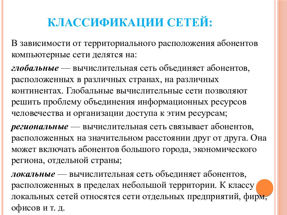 В зависимости от территориального расположения абонентов компьютерные сети делятся на: глобальные — вычислительная сеть объединяет абонентов, расположенных в различных странах, на различных континентах. Глобальные вычислительные сети позволяют решить проблему объединения информационных ресурсов человечества и организации доступа к этим ресурсам; региональные — вычислительная сеть связывает абонентов, расположенных на значительном расстоянии друг от друга. Она может включать абонентов большого города, экономического региона, отдельной страны; локальные — вычислительная сеть объединяет абонентов, расположенных в пределах небольшой территории. К классу локальных сетей относятся сети отдельных предприятий, фирм, офисов и т. д.