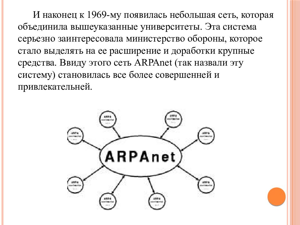 И наконец к 1969-му появилась небольшая сеть, которая объединила вышеуказанные университеты. Эта система серьезно заинтересовала министерство обороны, которое стало выделять на ее расширение и доработки крупные средства. Ввиду этого сеть ARPAnet (так назвали эту систему) становилась все более совершенней и привлекательней.