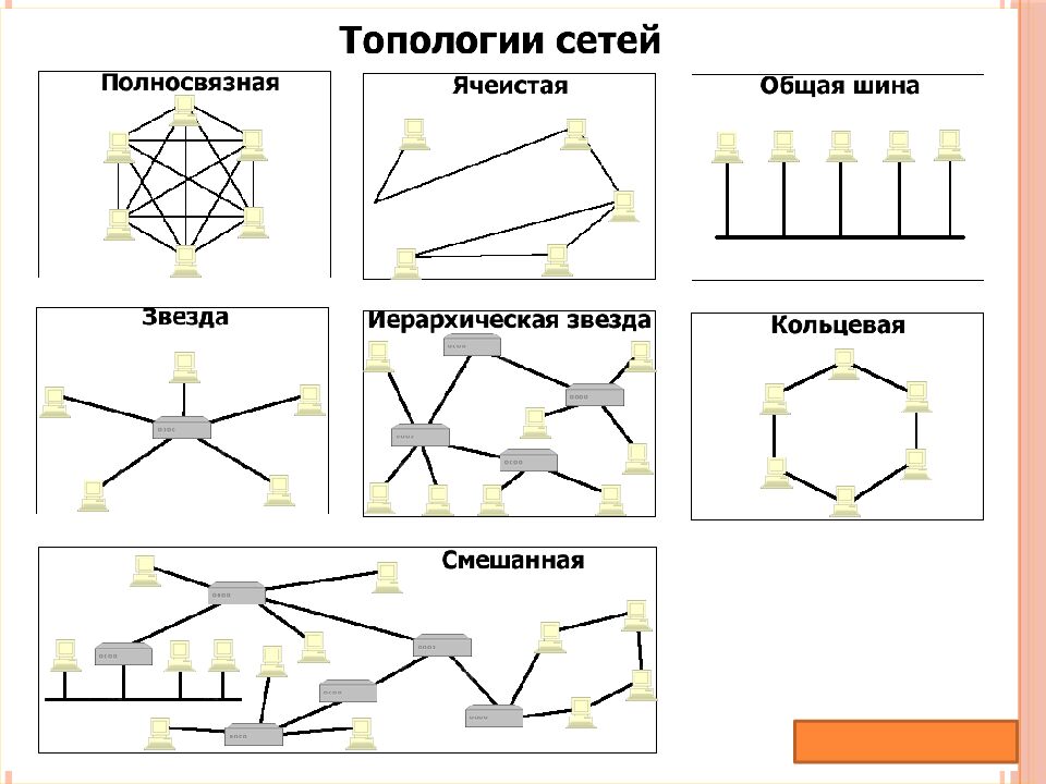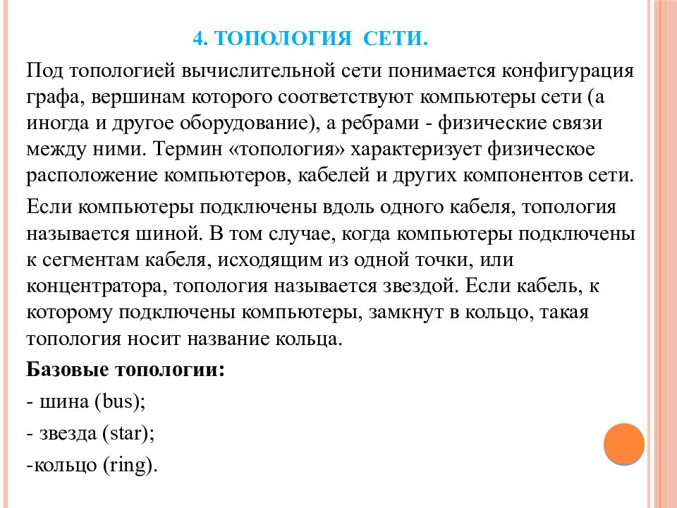 Под топологией вычислительной сети понимается конфигурация графа, вершинам которого соответствуют компьютеры сети (а иногда и другое оборудование), а ребрами - физические связи между ними. Термин «топология» характеризует физическое расположение компьютеров, кабелей и других компонентов сети. Если компьютеры подключены вдоль одного кабеля, топология называется шиной. В том случае, когда компьютеры подключены к сегментам кабеля, исходящим из одной точки, или концентратора, топология называется звездой. Если кабель, к которому подключены компьютеры, замкнут в кольцо, такая топология носит название кольца. Базовые топологии: - шина ( bus ); - звезда ( star ); -кольцо ( ring ).