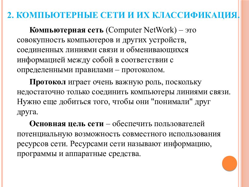 Компьютерная сеть ( Computer NetWork ) – это совокупность компьютеров и других устройств, соединенных линиями связи и обменивающихся информацией между собой в соответствии с определенными правилами – протоколом. Протокол играет очень важную роль, поскольку недостаточно только соединить компьютеры линиями связи. Нужно еще добиться того, чтобы они "понимали" друг друга. Основная цель сети – обеспечить пользователей потенциальную возможность совместного использования ресурсов сети. Ресурсами сети называют информацию, программы и аппаратные средства.