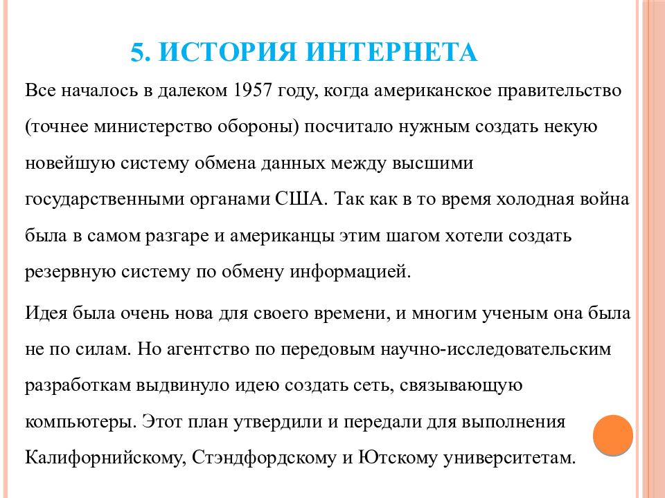 Все началось в далеком 1957 году, когда американское правительство (точнее министерство обороны) посчитало нужным создать некую новейшую систему обмена данных между высшими государственными органами США. Так как в то время холодная война была в самом разгаре и американцы этим шагом хотели создать резервную систему по обмену информацией. Идея была очень нова для своего времени, и многим ученым она была не по силам. Но агентство по передовым научно-исследовательским разработкам выдвинуло идею создать сеть, связывающую компьютеры. Этот план утвердили и передали для выполнения Калифорнийскому, Стэндфордскому и Ютскому университетам.
