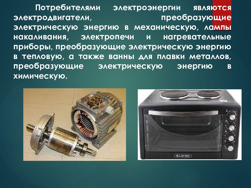 Потребителями электроэнергии являются электродвигатели, преобразующие электрическую энергию в механическую, лампы накаливания, электропечи и нагревательные приборы, преобразующие электрическую энергию в тепловую, а также ванны для плавки металлов, преобразующие электрическую энергию в химическую.