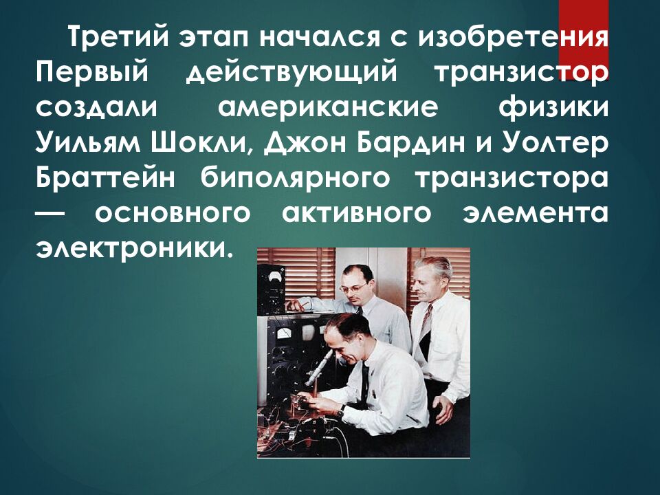 Третий этап начался с изобретения Первый действующий транзистор создали американские физики Уильям Шокли, Джон Бардин и Уолтер Браттейн биполярного транзистора — основного активного элемента электроники.
