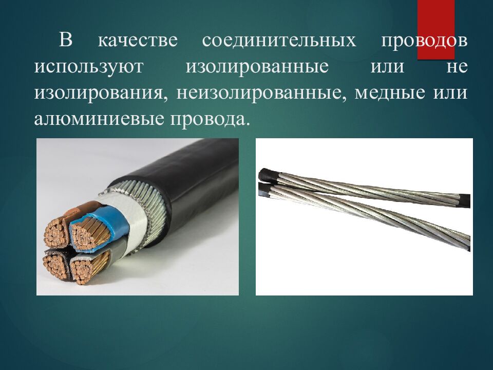 Слайд 12: В качестве соединительных проводов используют изолированные или не изолирования, неизолированные, медные или алюминиевые провода