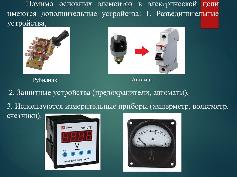 Помимо основных элементов в электрической цепи имеются дополнительные устройства: 1. Разъединительные устройства, Рубилник Автамат 2. Защитные устройства (предохранители, автоматы), 3. Используются измерительные приборы (амперметр, вольтметр, счетчики).