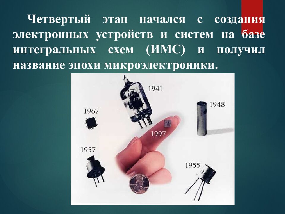 Четвертый этап начался с создания электронных устройств и систем на базе интегральных схем ( ИМС ) и получил название эпохи микроэлектроники.