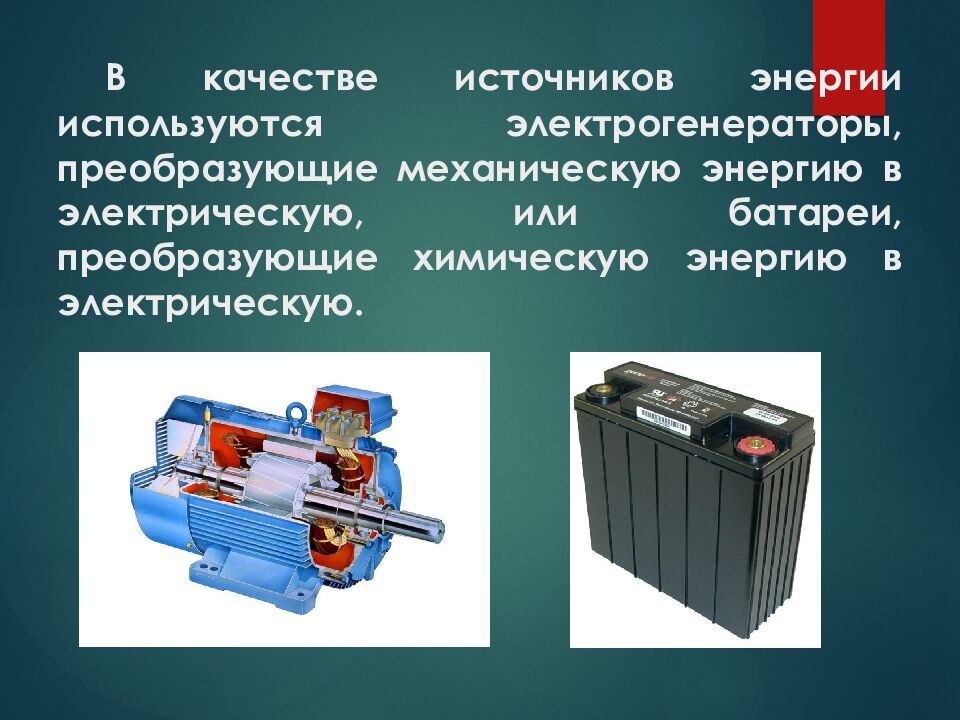 Слайд 10: В качестве источников энергии используются электрогенераторы, преобразующие механическую энергию в электрическую, или батареи, преобразующие химическую энергию в электрическую