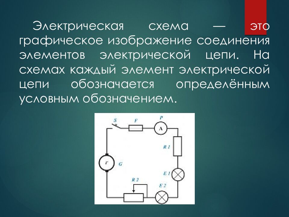 Электрическая схема — это графическое изображение соединения элементов электрической цепи. На схемах каждый элемент электрической цепи обозначается определённым условным обозначением.