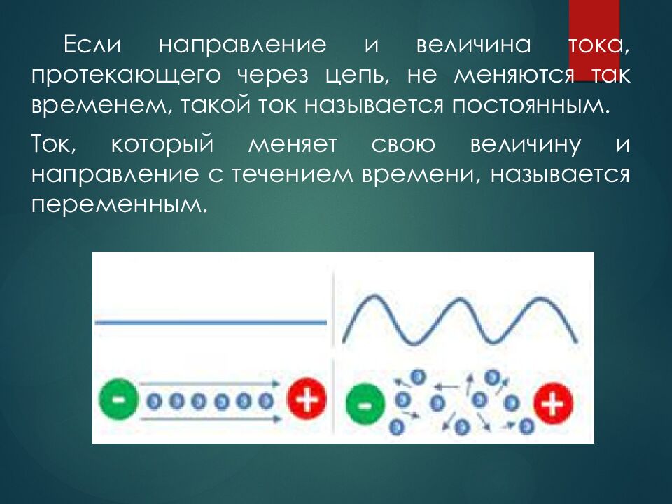Если направление и величина тока, протекающего через цепь, не меняются так временем, такой ток называется постоянным. Ток, который меняет свою величину и направление с течением времени, называется переменным.